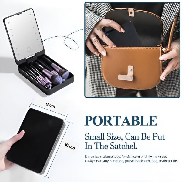 Sada štětců a LED zrcátko se perfektně vejdou do kabelky, takže si můžete snadno upravit make-up, ať už vás den zavede kamkoli.