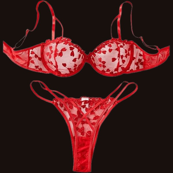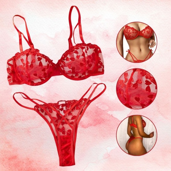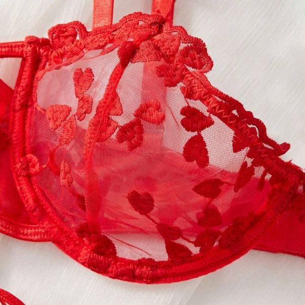 Tato červená souprava spodního prádla je ideální volbou na Valentýna! Díky složitým výšivkám srdíček a jemným detailům z průsvitné síťoviny je tato souprava navržena tak, aby podtrhla váš romantický půvab.